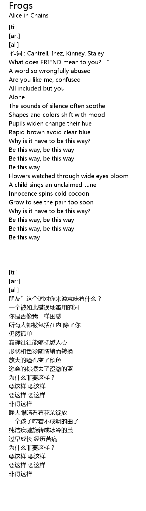 | [00:00.00] | 作词 : Cantrell, Inez, Kinney, Staley |
