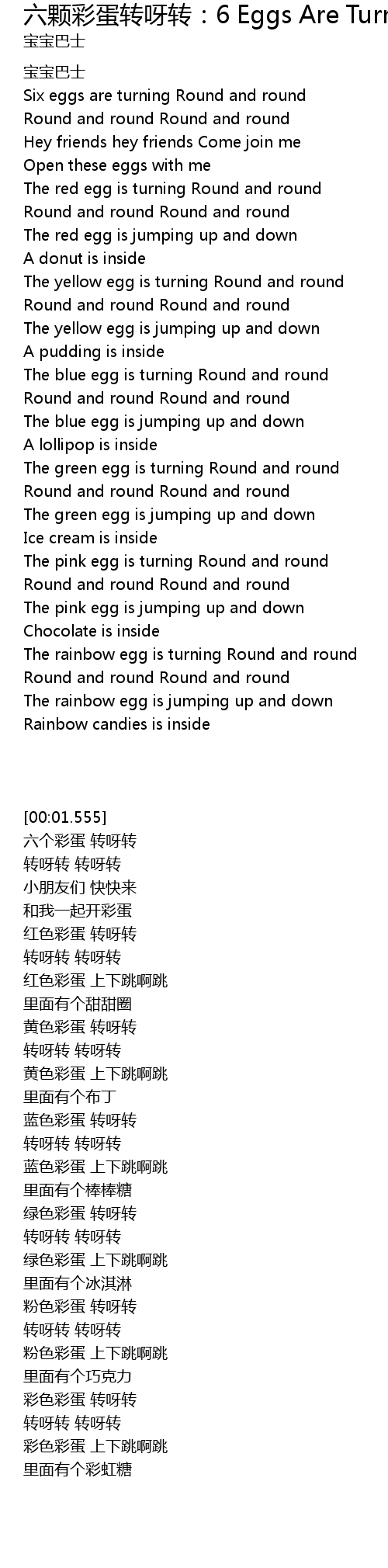 | [01:30.858] | The rainbow egg is turning Round and round |