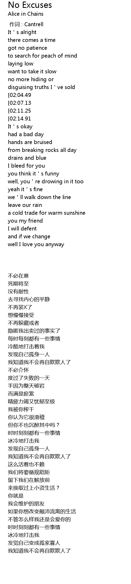 | [03:35.58][02:14.91][01:09.71] | no excuses, then I know |