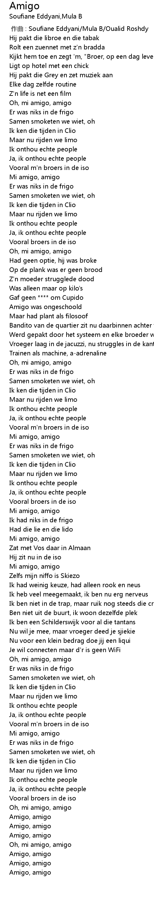 | [00:03.86] | Kijkt hem toe en zegt ' m, " Broer, op een dag leven we goed" |