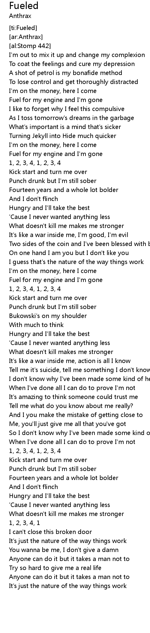| [00:55.93] | Fuel for my engine and I'm gone |
