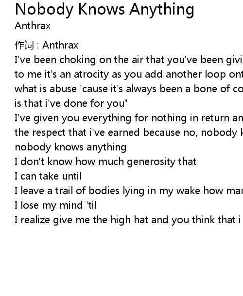 | I' ve given you everything for nothing in return and i' m so tired of bleeding for the respect that i' ve earned because no, nobody knows, nobody knows because nobody knows anything | |
