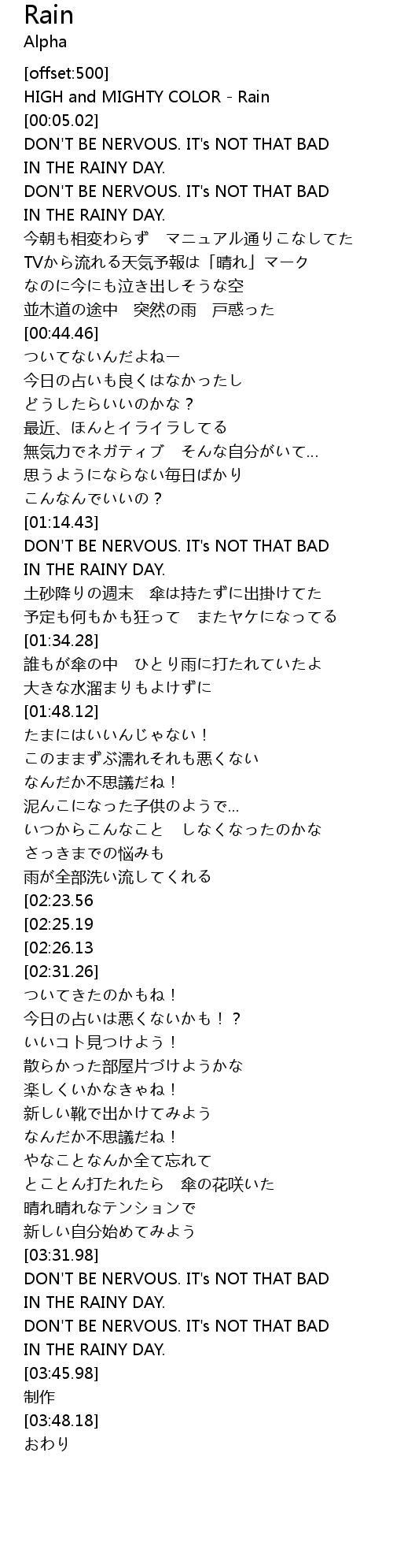 | [00:00.00] | HIGH and MIGHTY COLOR Rain |