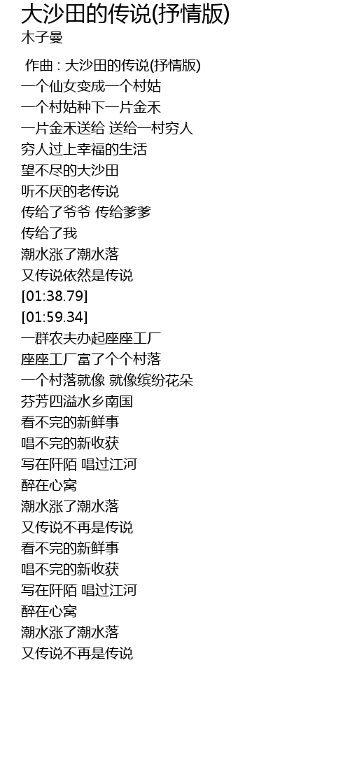 | [00:00.00] | 作曲 : 大沙田的传说(抒情版) |