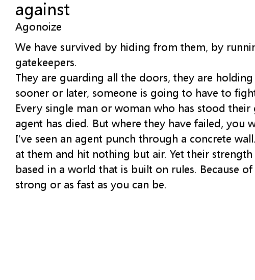 I've seen an agent punch through a concrete wall. Men have emptied entire clips at them and hit nothing but air. Yet their strength and their speed are still based in a world that is built on rules. Because of that, they will never be as strong or as fast as you can be. |