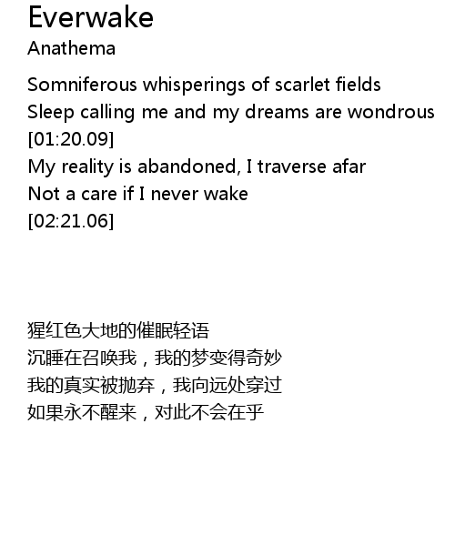 | [00:59.32] | Somniferous whisperings of scarlet fields |