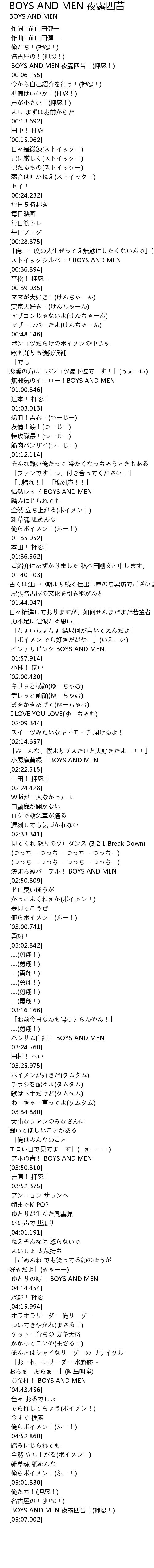 | [00:03.751] | BOYS AND MEN 夜露四苦!(押忍!) |