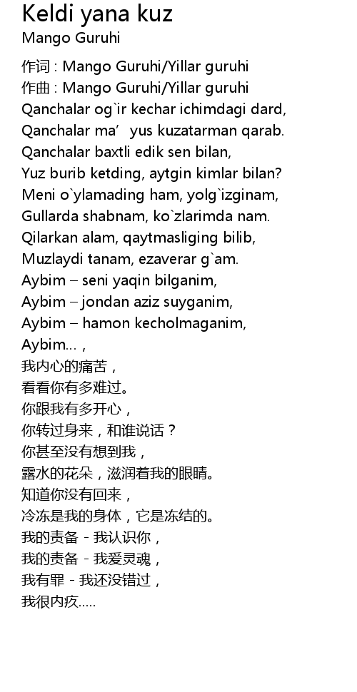 | 作词 : Mango Guruhi/Yillar guruhi | |