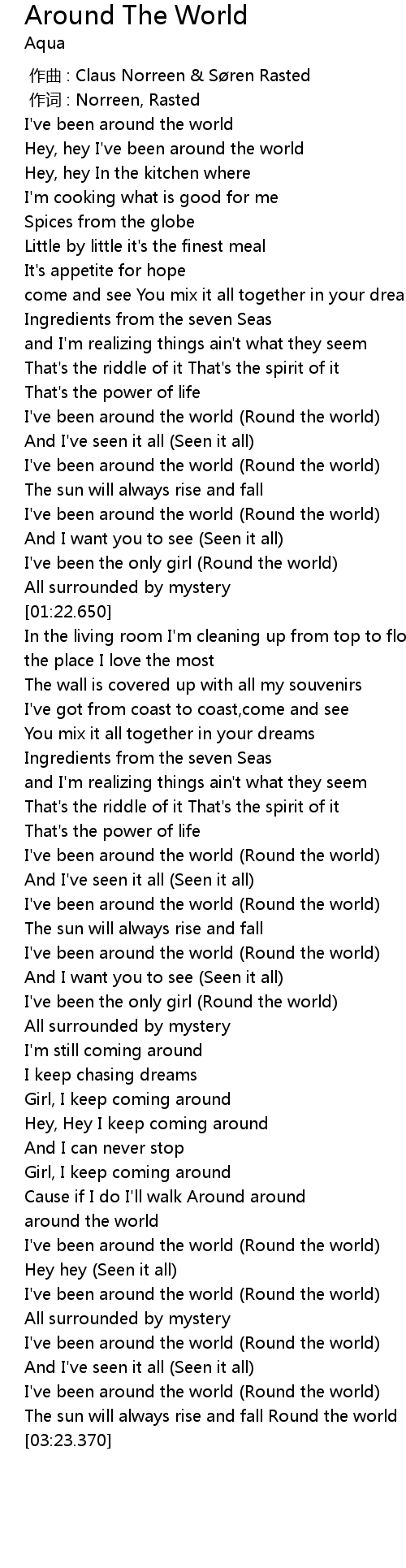 | [00:53.310] | I' ve been around the world Round the world |