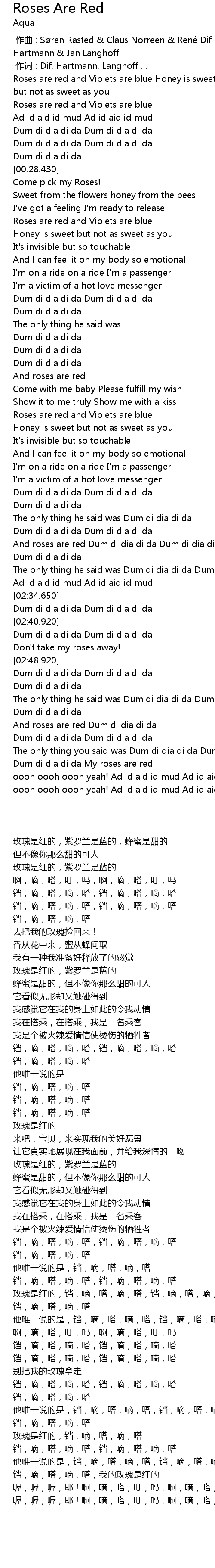 | [02:19.430] | And roses are red Dum di dia di da Dum di dia di da |