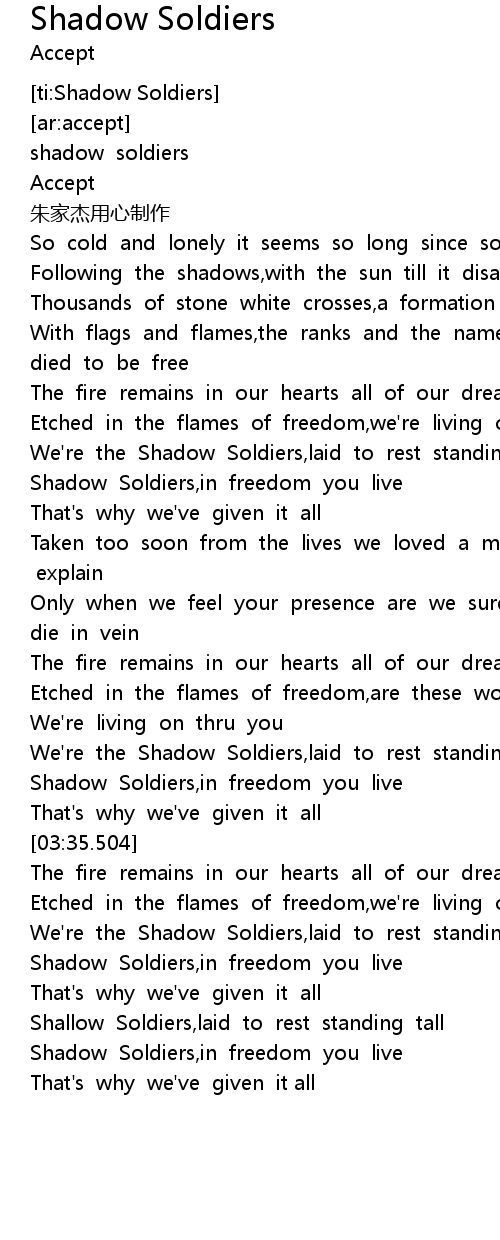 | [04:58.903] | We' re the Shadow Soldiers, laid to rest standing tall |
