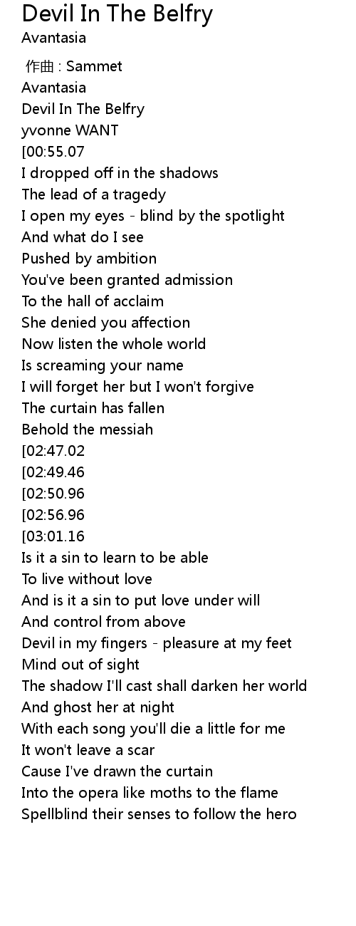 | [01:37.41][02:56.96][03:56.69][04:16.53] | I am I - the devil in the belfry |