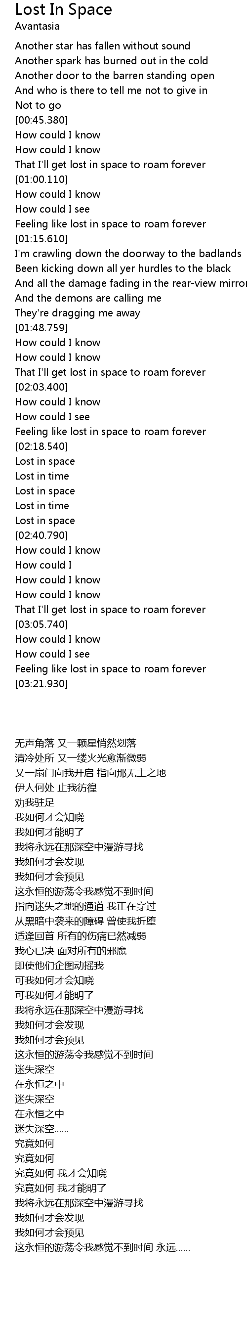| [03:16.0] | Feeling like lost in space to roam forever |