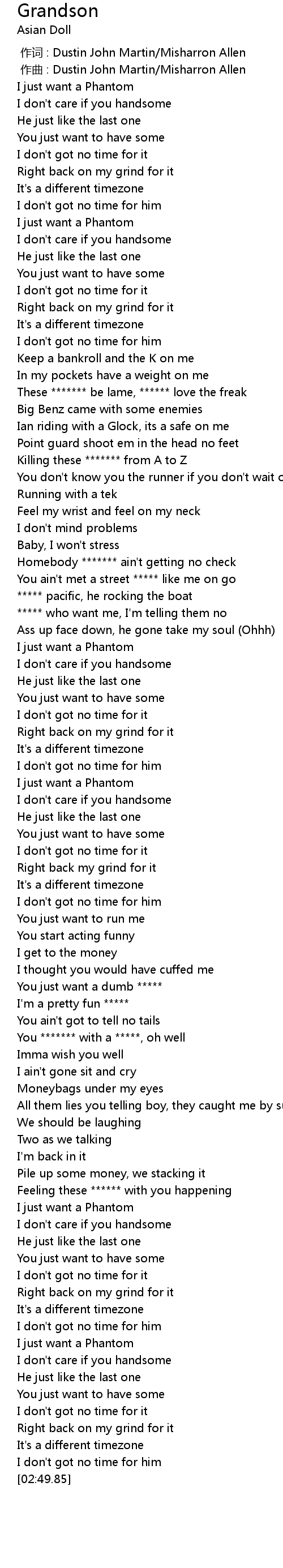 | [01:10.49] | Homebody ******* ain't getting no check |