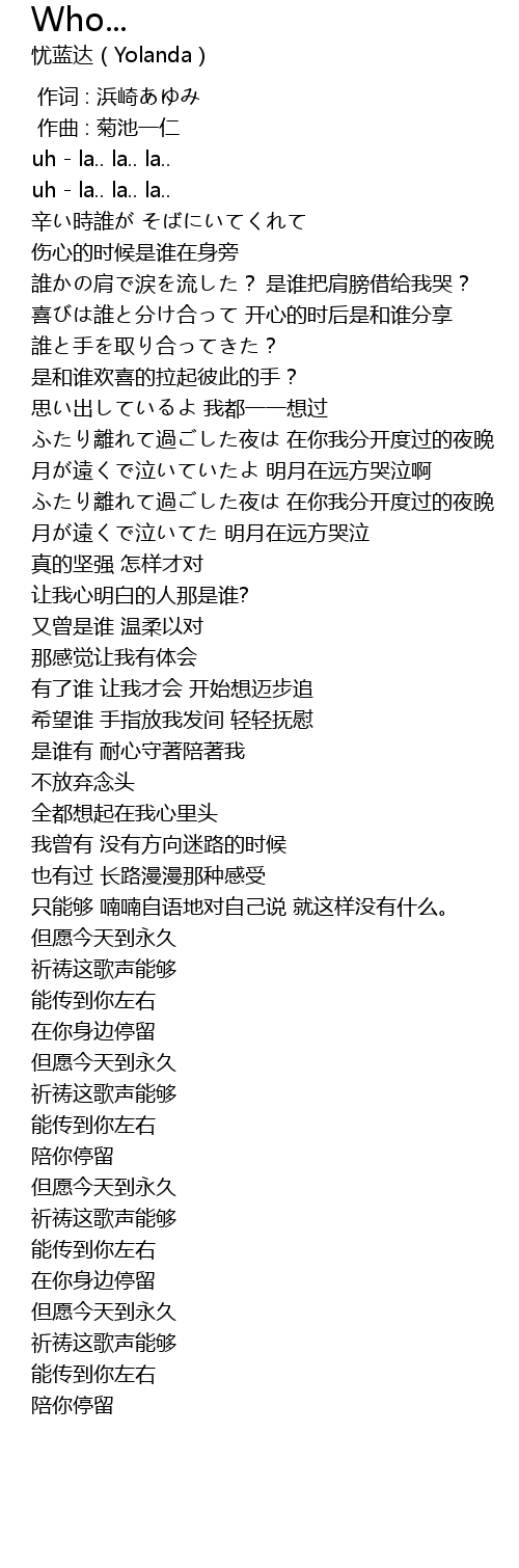 | [02:14.446] | ràng wǒ xīn míng bái de rén nà shi shuí? |