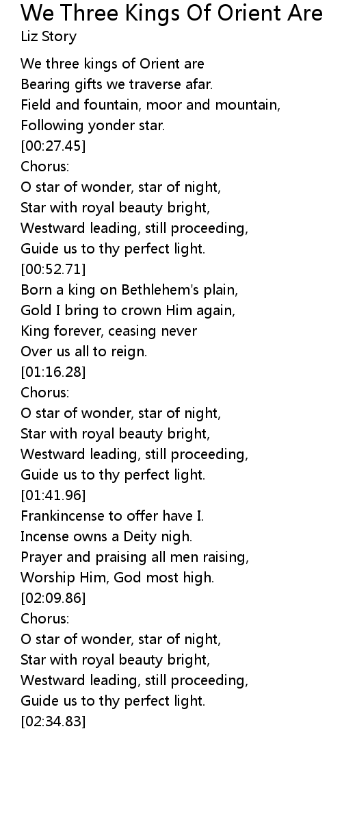 | [00:15.54] | Bearing gifts we traverse afar. |