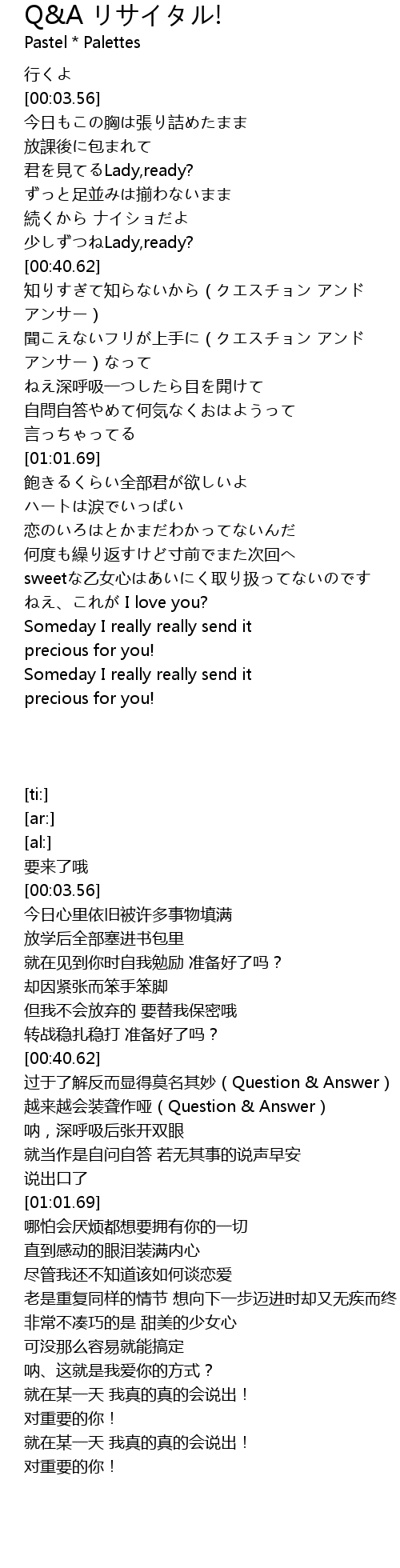 | [00:40.82] | 知りすぎて知らないから(クエスチョン アンド アンサー) |