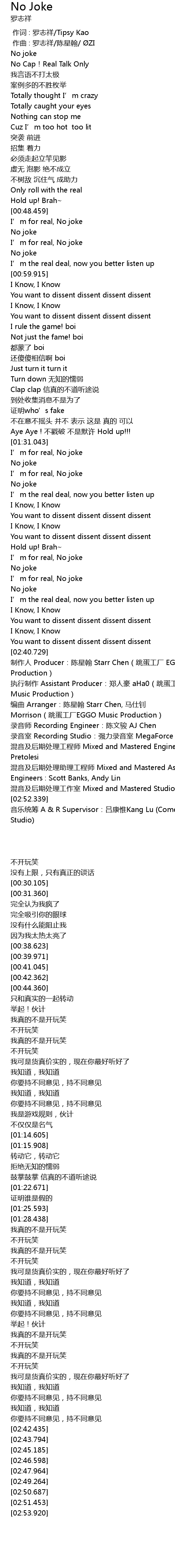 | [01:28.438] | Aye Aye ! bù chuō pò bú shì mò xǔ Hold up!!! |