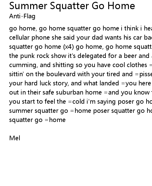 go home, go home squatter go home i think i hear your mommy callin' on =your cellular phone she said your dad wants his car back so you'd better =go home squatter go home (x4) go home, go home squatter go home you got =no money for the punk rock show it's delegated for a beer and a ho =spitting, pissing, cumming, and shitting so you have cool clothes =squatter go home i see you sittin' on the boulevard with your tired and =pissed off stare tellin' everyone your hard luck story, and what landed =you here you think of mommy and of daddy out in their safe suburban home =and you know that's where you're gonna be when you start to feel the =cold i'm saying poser go home poser squatter go home summer squatter go =home poser squatter go home squatter go home (x4) summer squatter go =home |