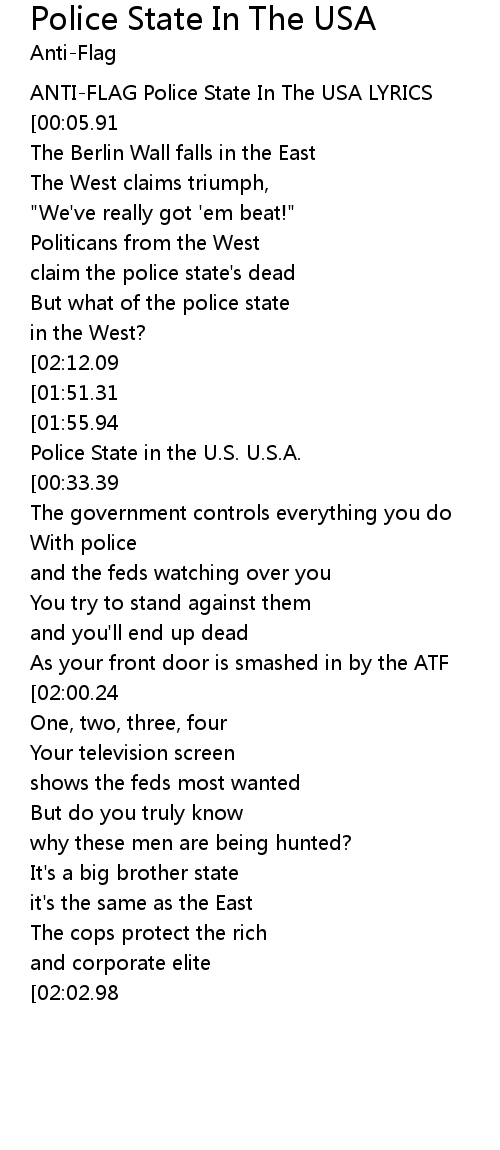| [02:18.95][02:00.24][01:04.49] | Police State in the U.S. U.S.A. |