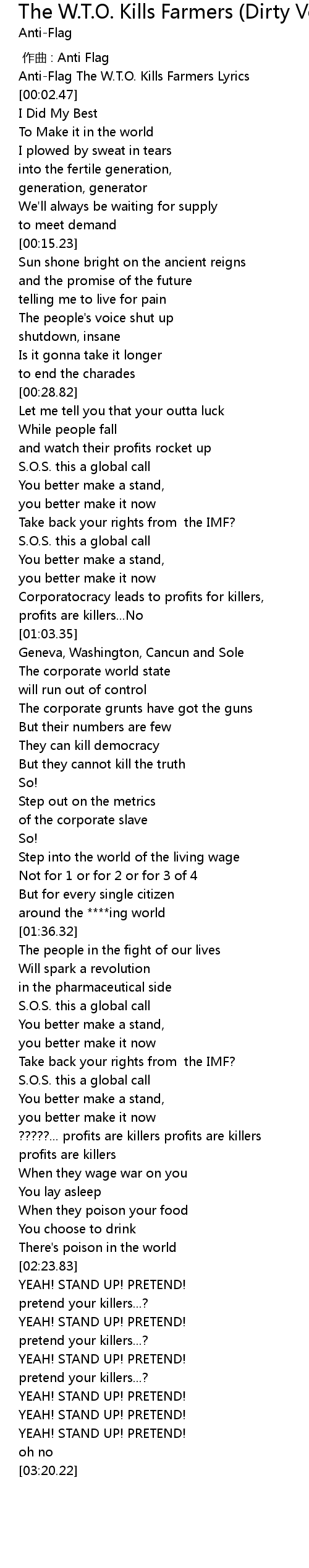 | [00:01.45] | AntiFlag The W. T. O. Kills Farmers Lyrics |