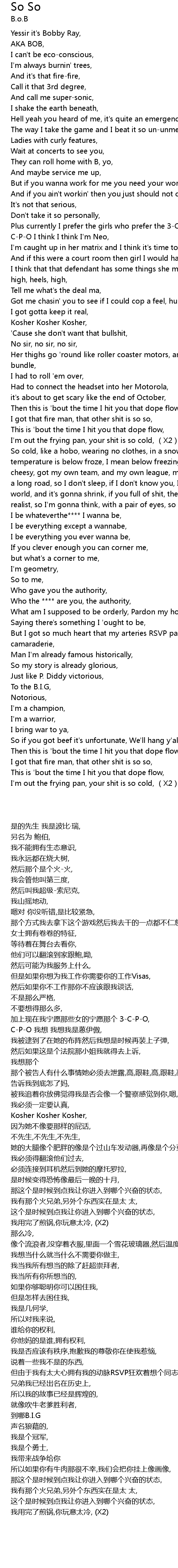 | [01:55.15] | So cold, like a hobo, wearing no clothes, in a snow globe, and the temperature is below froze, I mean below freezing, there' s no reason, to be so cheesy, got my own team, and my own league, my own lane, and my own speed, it' s a long road, so I don' t sleep, if I don' t know you, I don' t speak, It' s a small world, and it' s gonna shrink, if you full of shit, then you gonna stink, I' m a realist, so I' m gonna think, with a pair of eyes, so I' m gonna see, |
