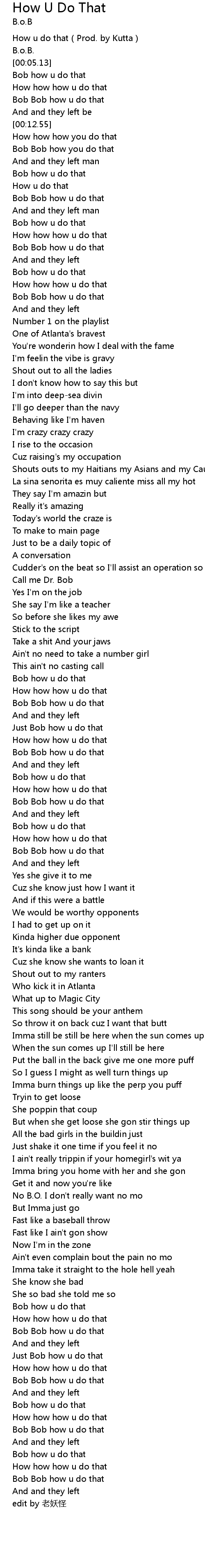 | [00:20.94] | Bob Bob how u do that |
