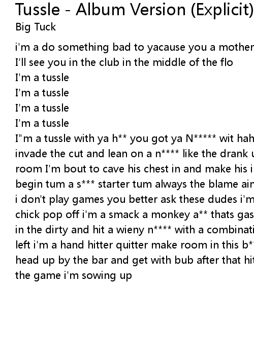 I"m a tussle with ya h** you got ya N***** wit hahold up purple one let o tum invade the cut and lean on a n**** like the drank up in my cup everybody make room I'm bout to cave his chest in and make his i swell up to where his edge up begin tum a s*** starter tum always the blame aint never played sports therefore i don't play games you better ask these dudes i'm a rock a n**** a** if your chick pop off i'm a smack a monkey a** thats gasta ganstafied thats how we do it in the dirty and hit a wieny n**** with a combination flury left right right left i'm a hand hitter quitter make room in this b**** when d.s.r in it i'm a head up by the bar and get with bub after that hit vip and fire up some drugsand the game i'm sowing up |