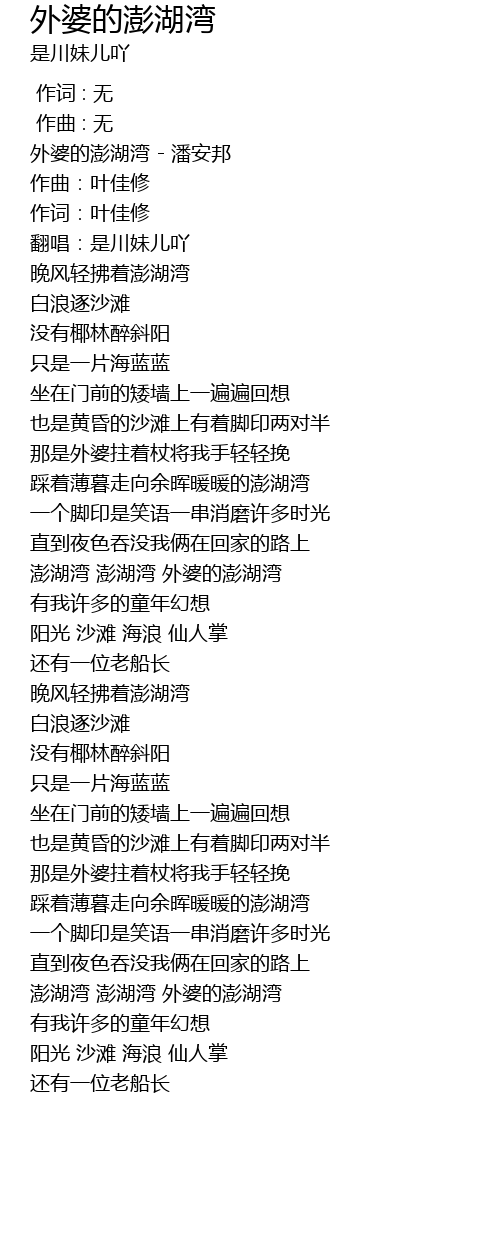 | [01:05.659] | 澎湖湾 澎湖湾 外婆的澎湖湾 |