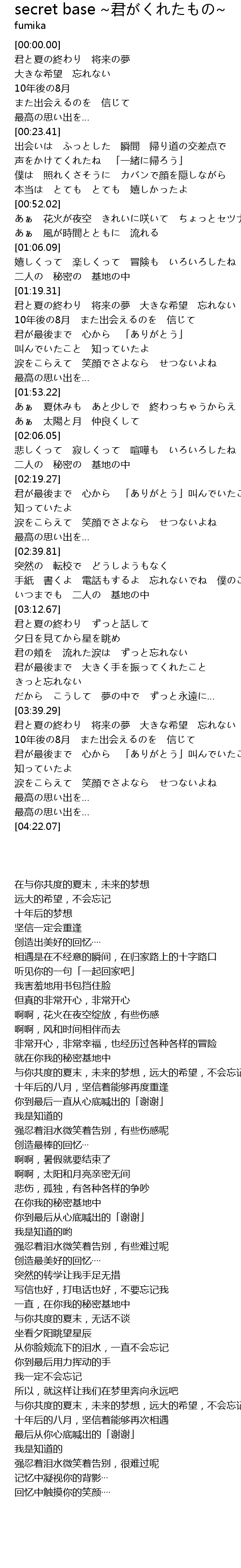 | [03:06.18] | いつまでも 二人の 基地の中 |