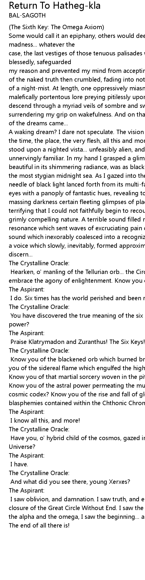 A waking dream? I dare not speculate. The vision was mine, the soul too... but the time, the place, the very flesh, all this and more was unknown to me. I stood upon a nighted vista... unfeasibly alien, and yet at once wholly, unnervingly familiar. In my hand I grasped a glimmering crystal which although beautiful in its shimmering radiance, was as black as the impenetrable depths of the most stygian midnight sea. As I gazed into the obsidian heart of the gem, a needle of black light lanced forth from its multi-faceted surface and filled my eyes with a panoply of fantastic hues, revealing to me in between its pulses of massing darkness certain fleeting glimpses of places and things so fantastically terrifying that I could not faithfully begin to recount their hideous and yet grimly compelling nature. A terrible sound filled my ears... an insidious resonance which sent waves of excruciating pain coursing through my mind... a sound which inexorably coalesced into a recognizable but entirely inhuman voice, a voice which slowly, inevitably, formed approximations of words which I could discern... |