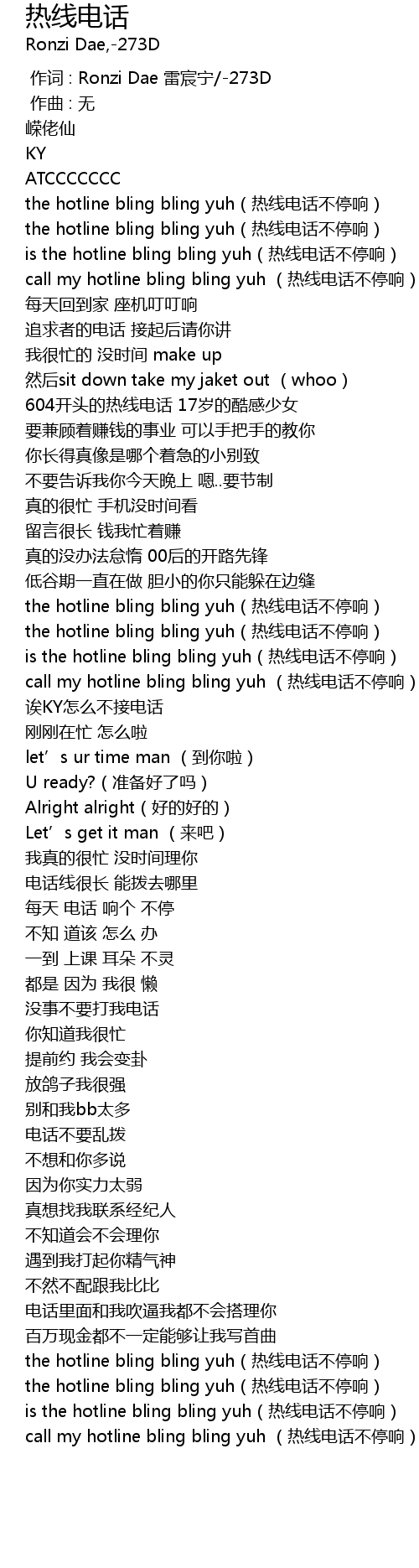| [00:18.205] | is the hotline bling bling yuh re xian dian hua bu ting xiang |