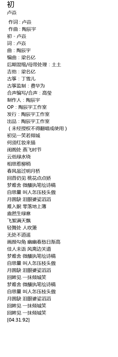 | [04:22.39] | 回眸见 一抹倾城笑 |