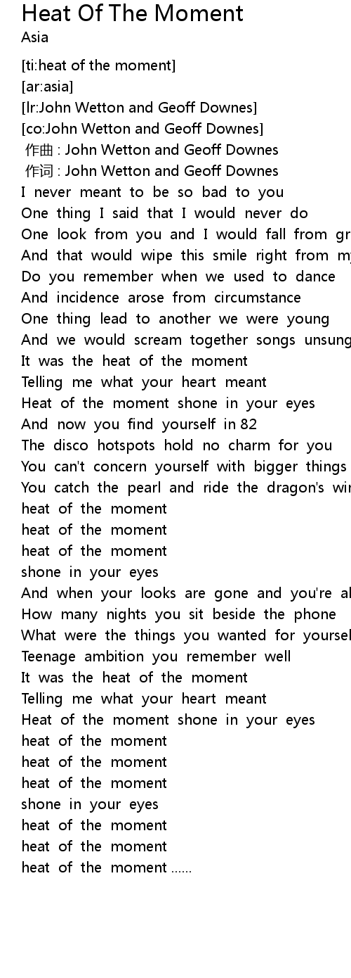 | [00:59.122] | Heat of the moment shone in your eyes |