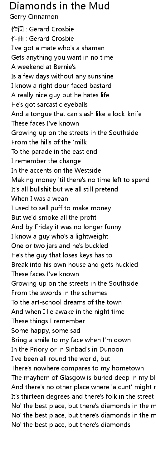 | [04:17.000] | No' the best place, but there' s diamonds in the mud |