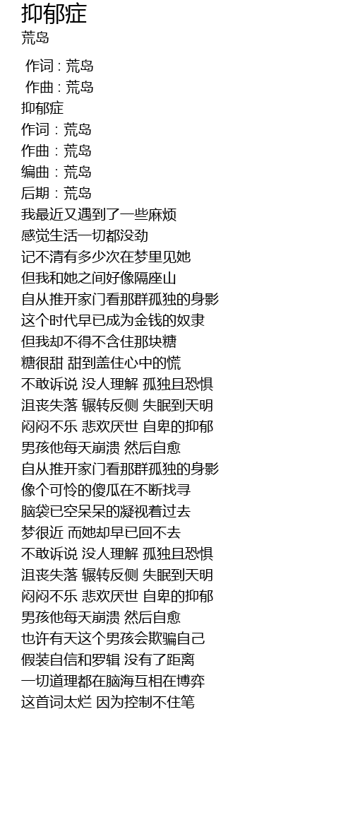 | [02:26.663] | 闷闷不乐 悲欢厌世 自卑的抑郁 |
