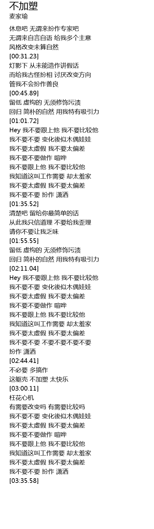 | [02:34.90] | wǒ bú yào tài xū jiǎ wǒ bú yào tài piān chā |