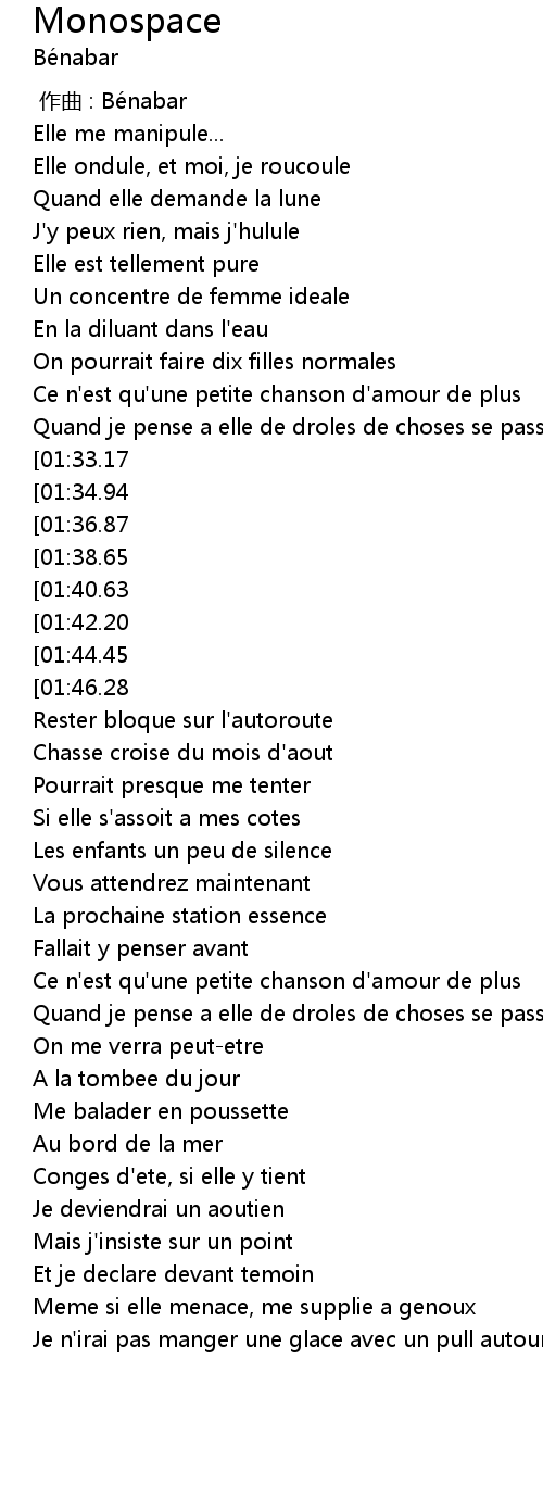 | [02:16.78][01:38.65][00:45.12] | Au volant d' un monospace |