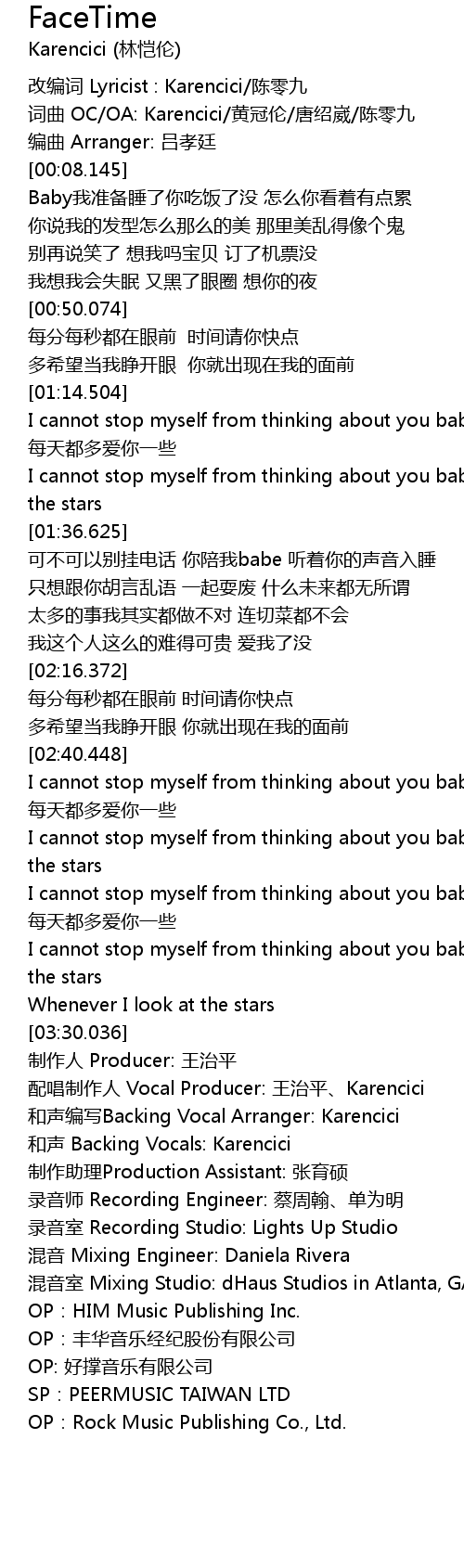 | [03:31.935] | 配唱制作人 Vocal Producer: 王治平、Karencici |