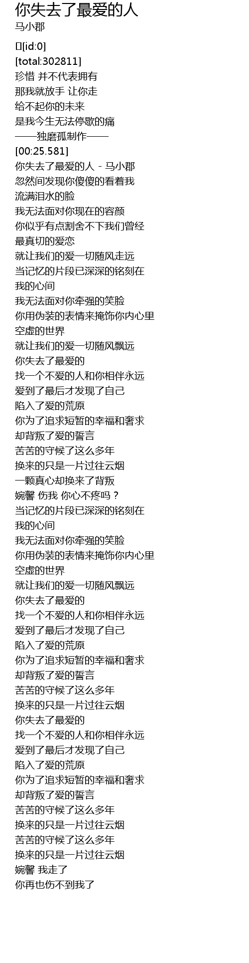 | [00:32.188] | 你失去了最爱的人 - 马小郡 |