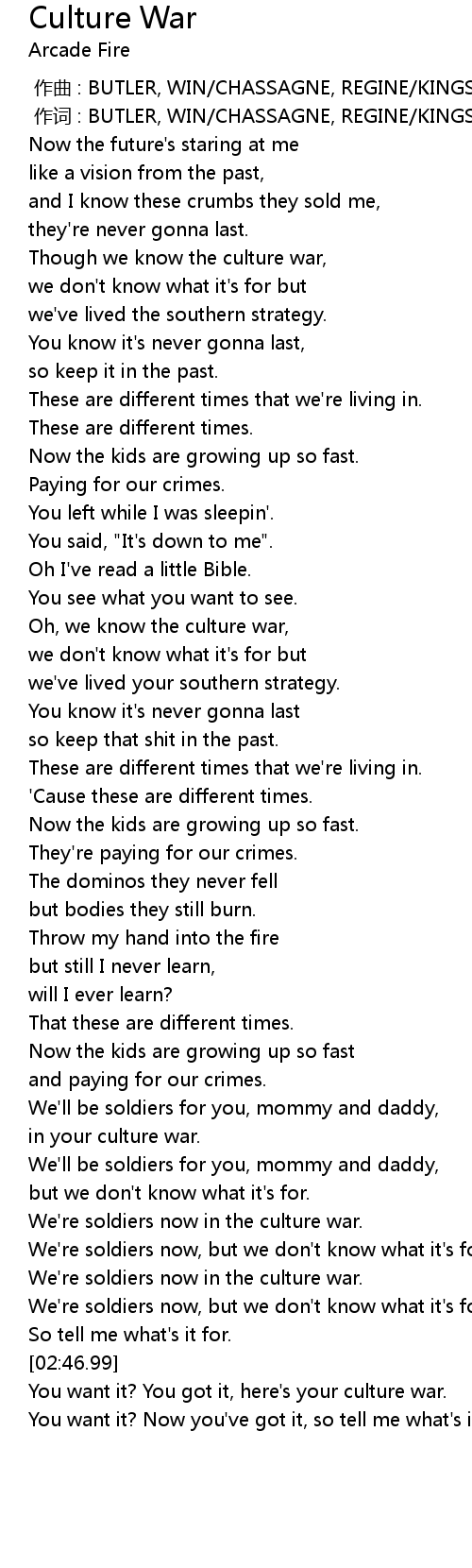 | [02:43.37] | We're soldiers now in the culture war. |