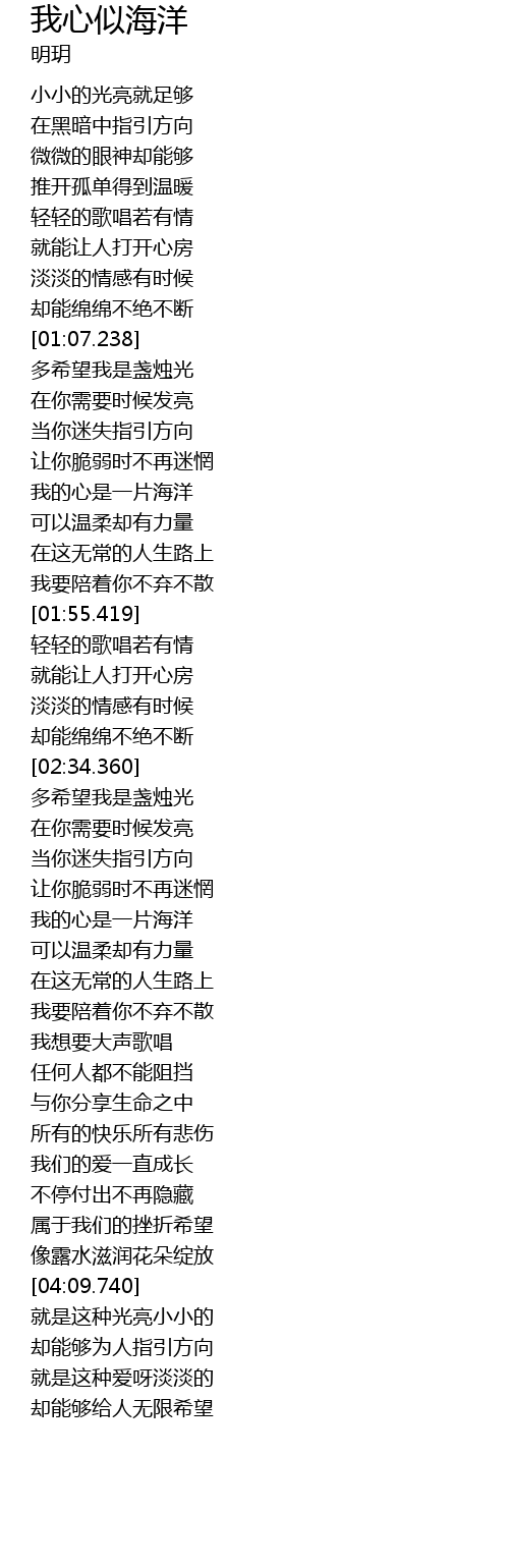| [01:30.768] | wǒ de xīn shì yī piàn hǎi yáng |