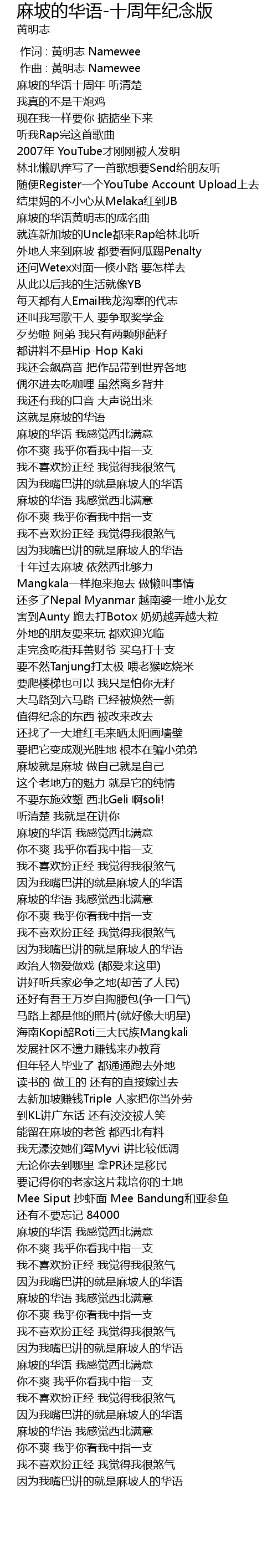 | [01:13.29] | 因为我嘴巴讲的就是麻坡人的华语 |