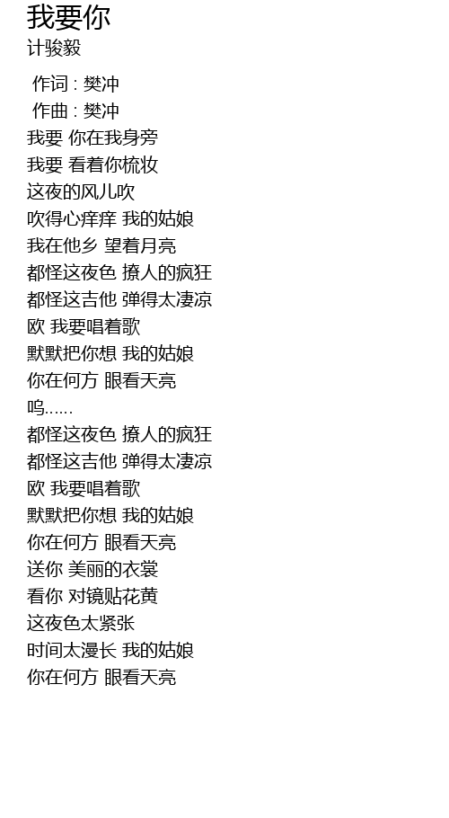 | [00:02.034] | wǒ yào nǐ zài wǒ shēn páng |