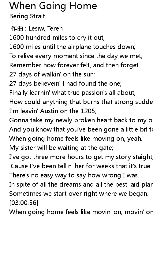 | [03:19.70] | When going home feels like movin' on; movin' on; movin' on. |