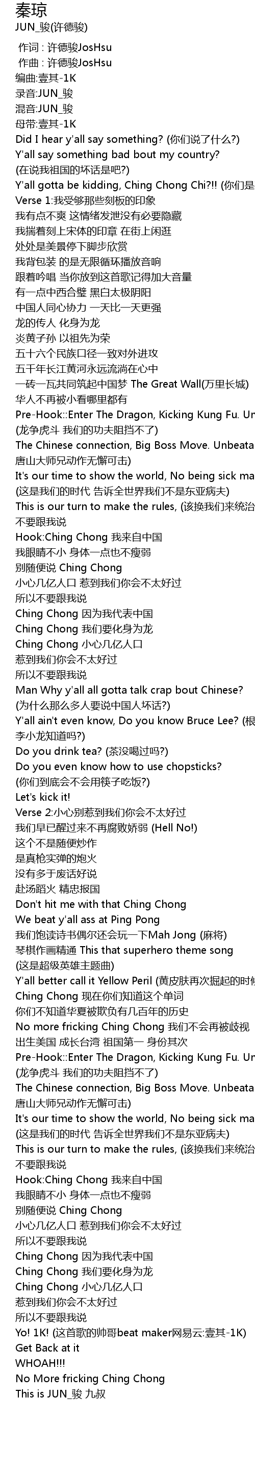 | [01:03.988] | Hook: Ching Chong wǒ lái zì zhōng guó |