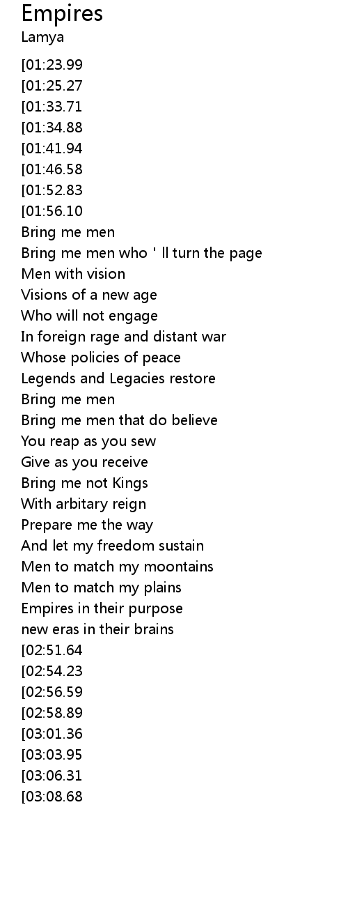 | [03:49.67][01:41.94][00:25.21] | Men with Empires |