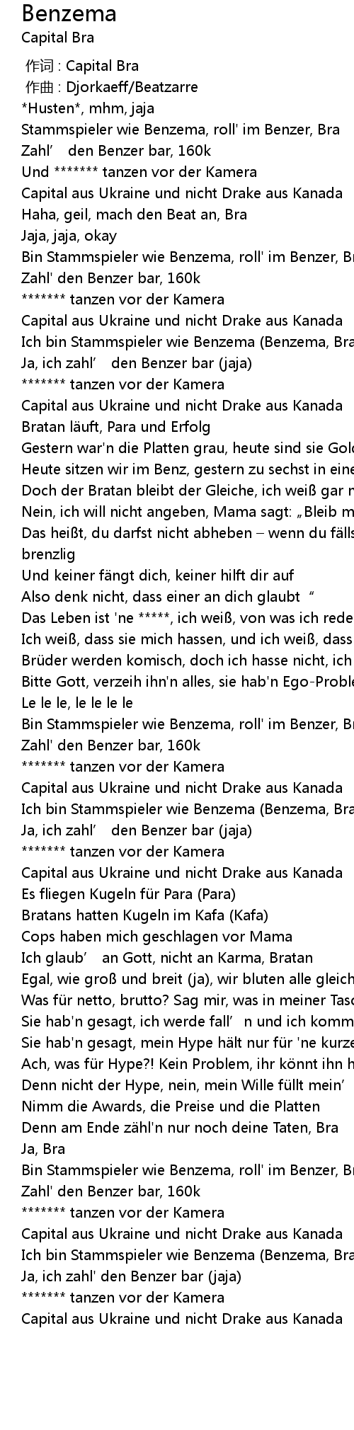 | [00:35.03] | Ich bin Stammspieler wie Benzema Benzema, Bra |