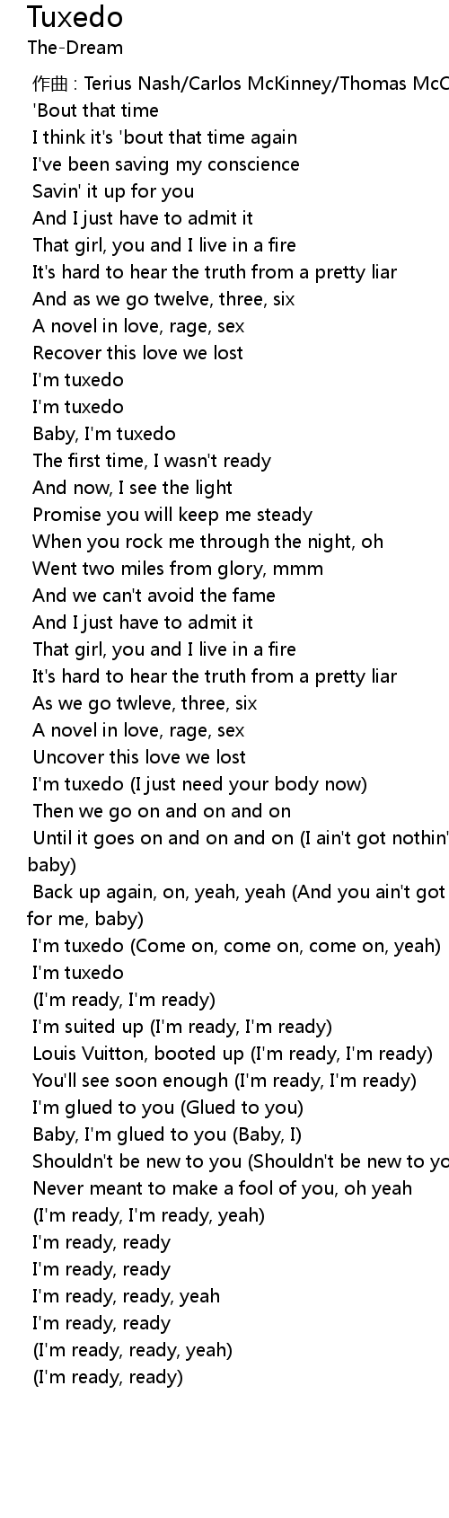| [01:12.102] | Baby, I' m tuxedo |