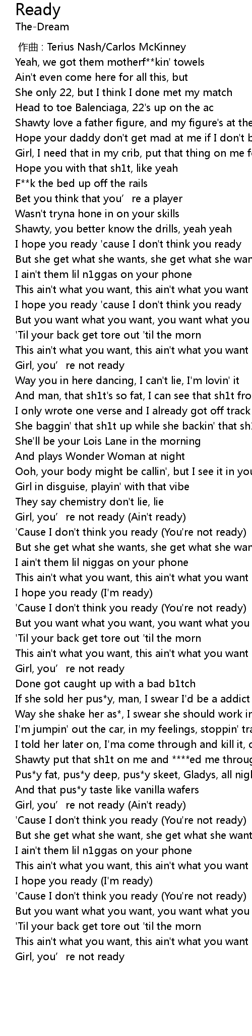 | [01:47.568] | Girl, you' re not ready Ain' t ready |